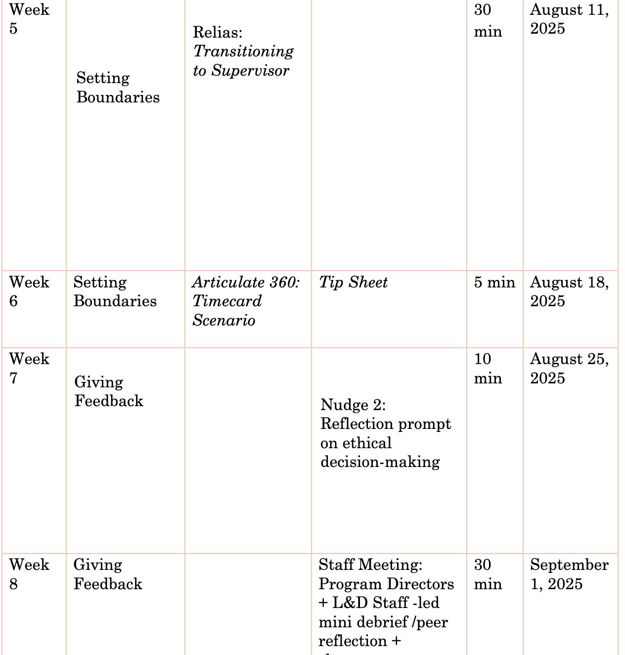 This 8-week blended learning experience combines LMS courses, custom scenario-based microlearning, tip sheets, SMS nudges, and optional peer reflection prompts.